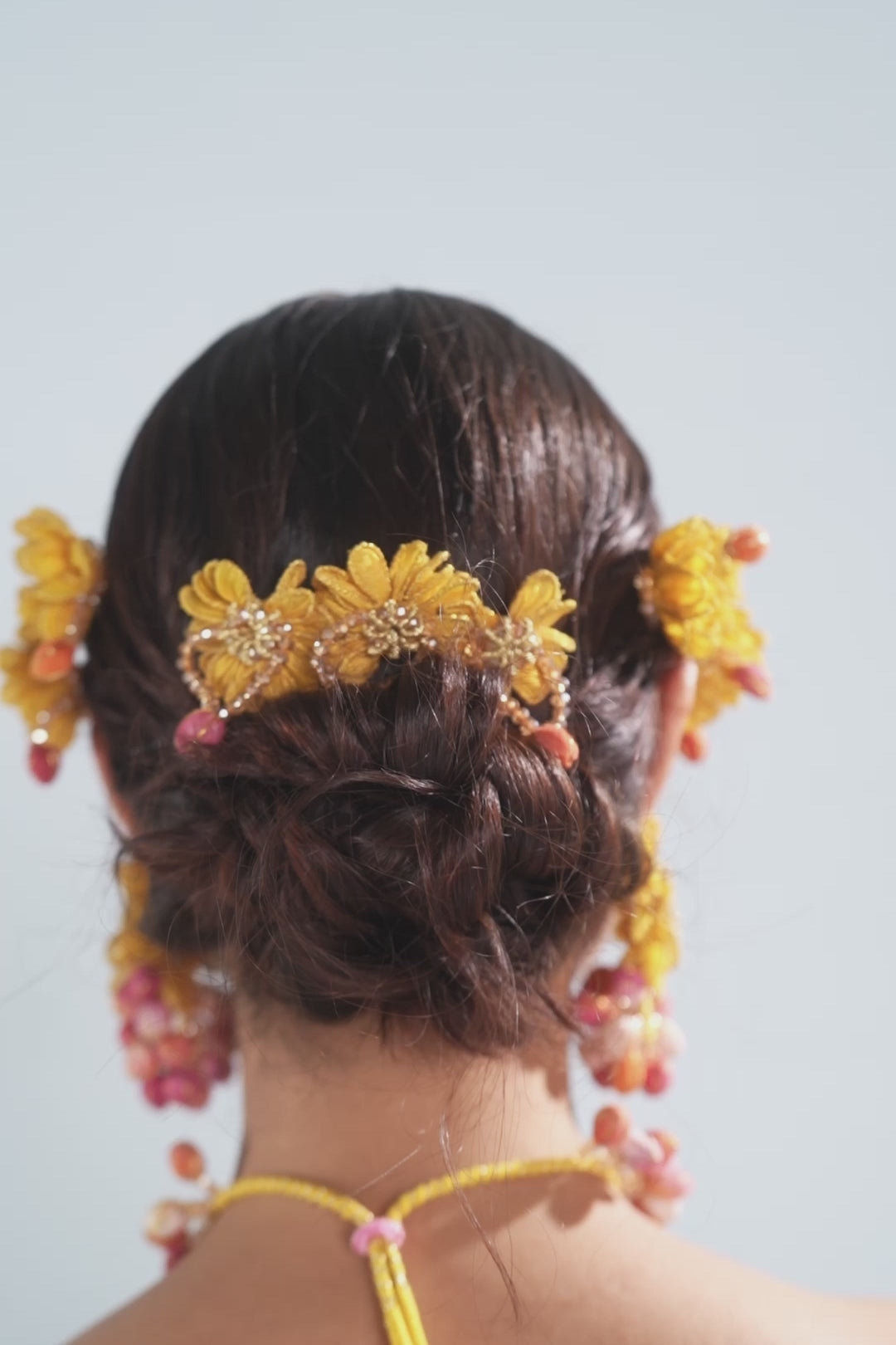 Amaltas hair accessory comes alive in tropical aesthetics with dainty white flowers bursting with happiness and warmth.