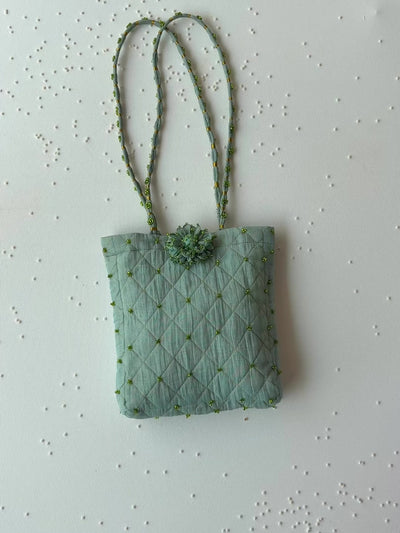 Our Aprajita Bag is a combination of blue and green creates a sophisticated and eye-catching aesthetic. The base of the bag features a pattern of green beads and gold check pattern, in the centre there is metallic button attached to it.