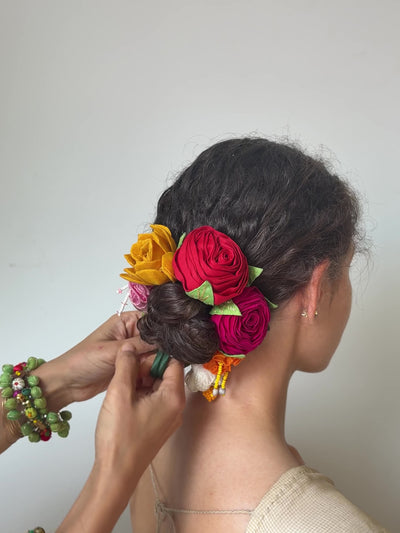 The Bagh Gajra captures the spirit of a flower-full garden. Handcrafted with big yet delicate fabric blossoms, it’s a tribute to nature’s most romantic place, the garden.