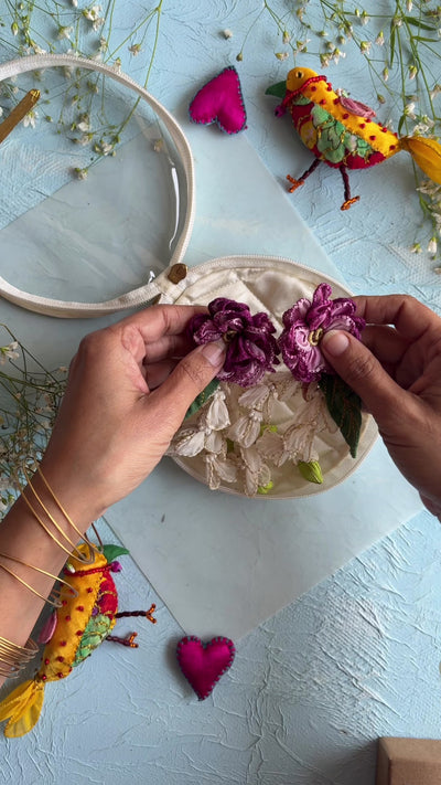 The Banphool Earrings, a handcrafted floral earrings blooming with hues of rich purple. Accentuated with delicate green leaves with golden detailing and mogra flowers attached to green buds at the end, capturing the essence of blooming beauty of nature.