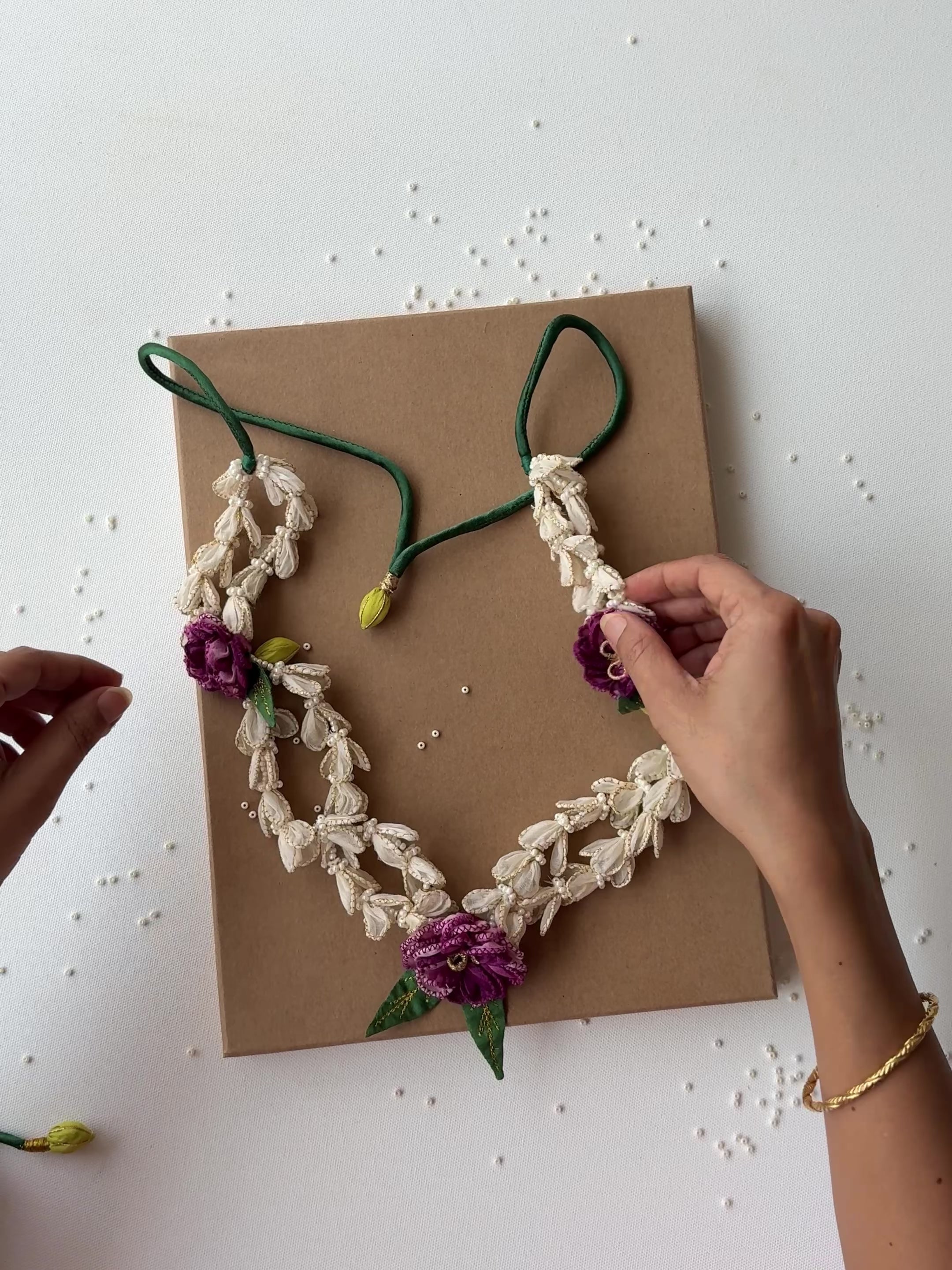 Glowy purple flower with green leaves attached at the bottom takes centre stage, with white mogra floral arrangement surrounding like a dreamy garden.