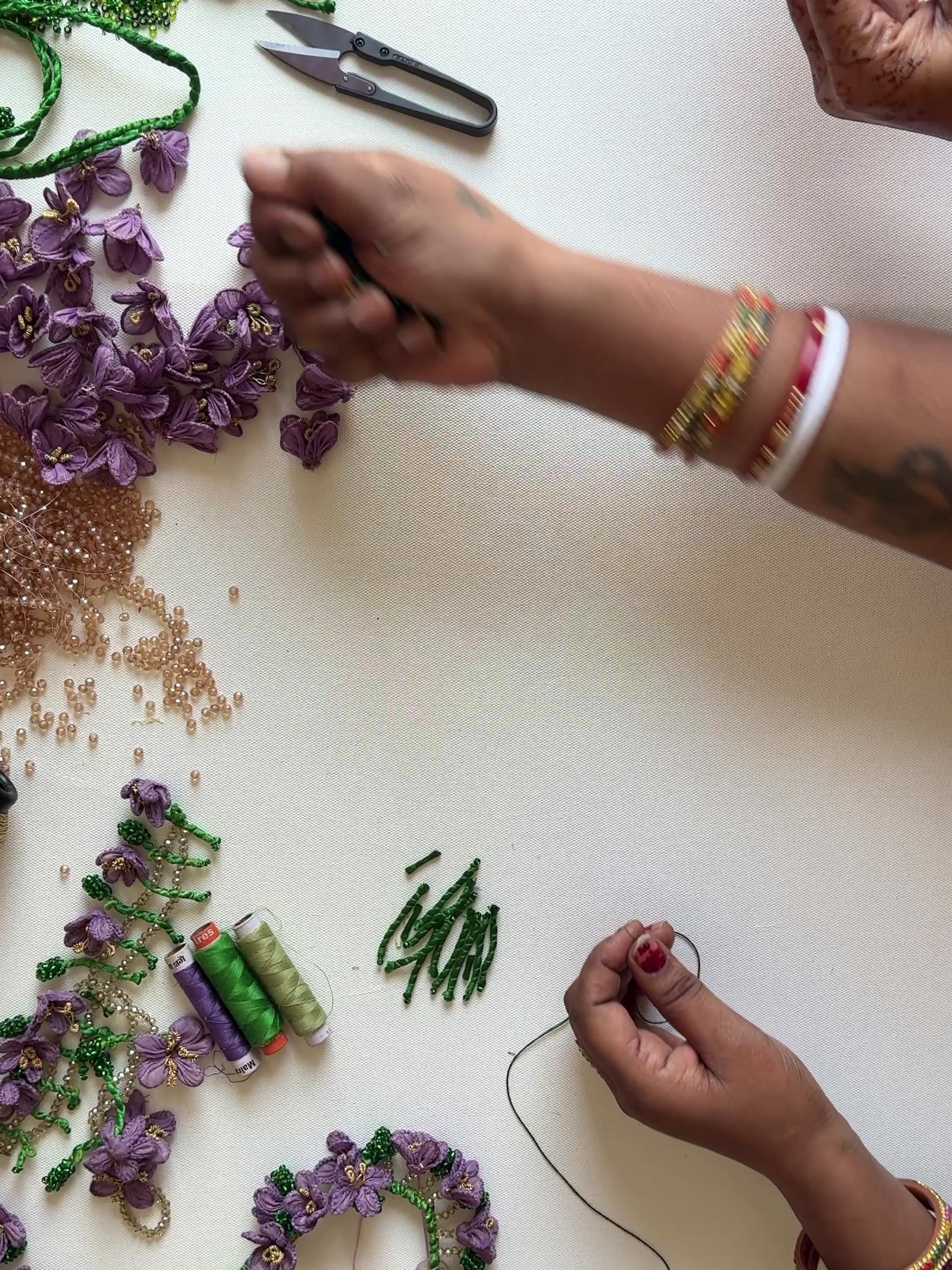 Crafted with four Chanderi flowers with Zari centers and a green berry drop on a Mashru string.