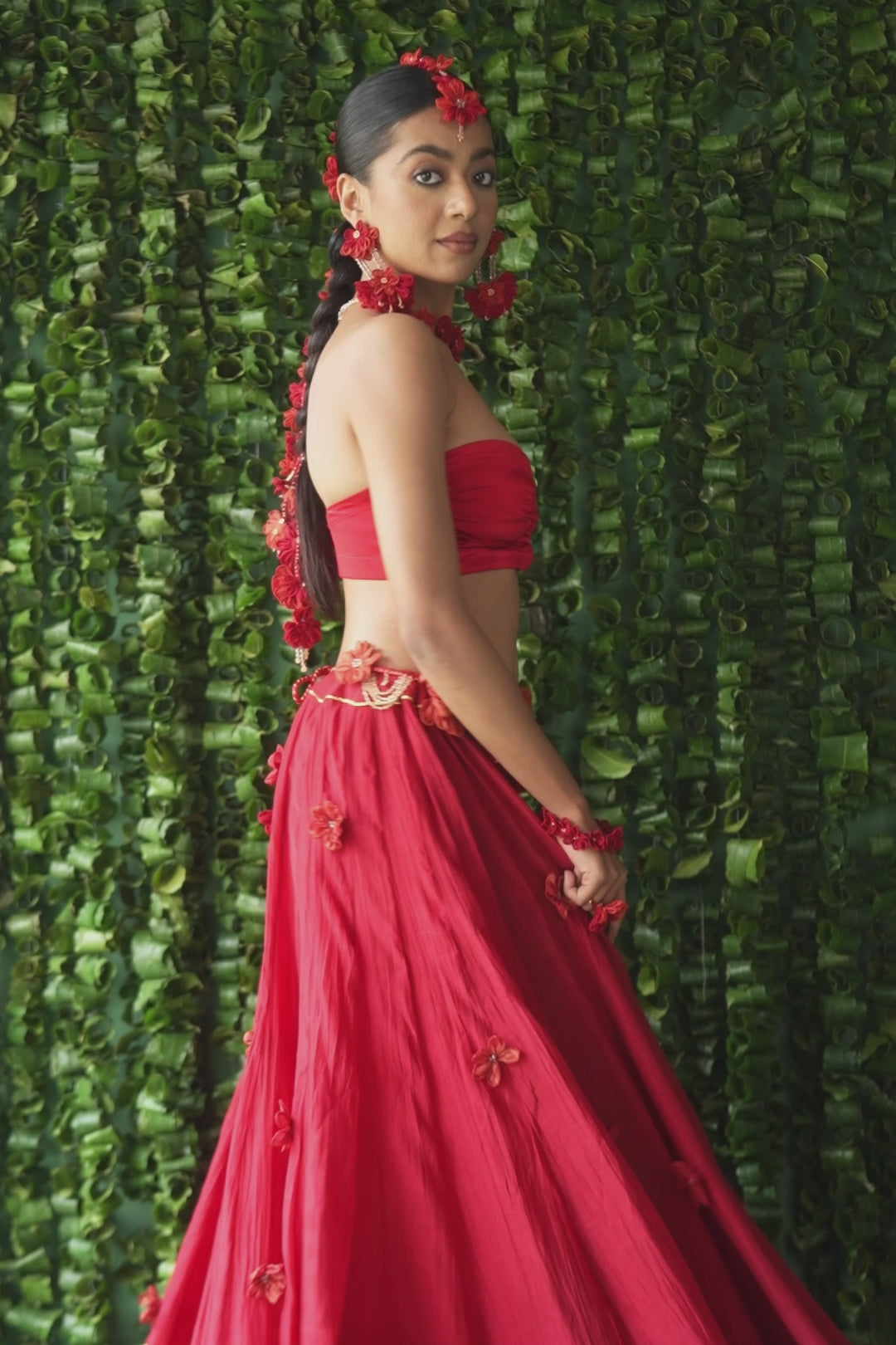 Classic red chanderi ghagra adorned with handmade flowers all over.