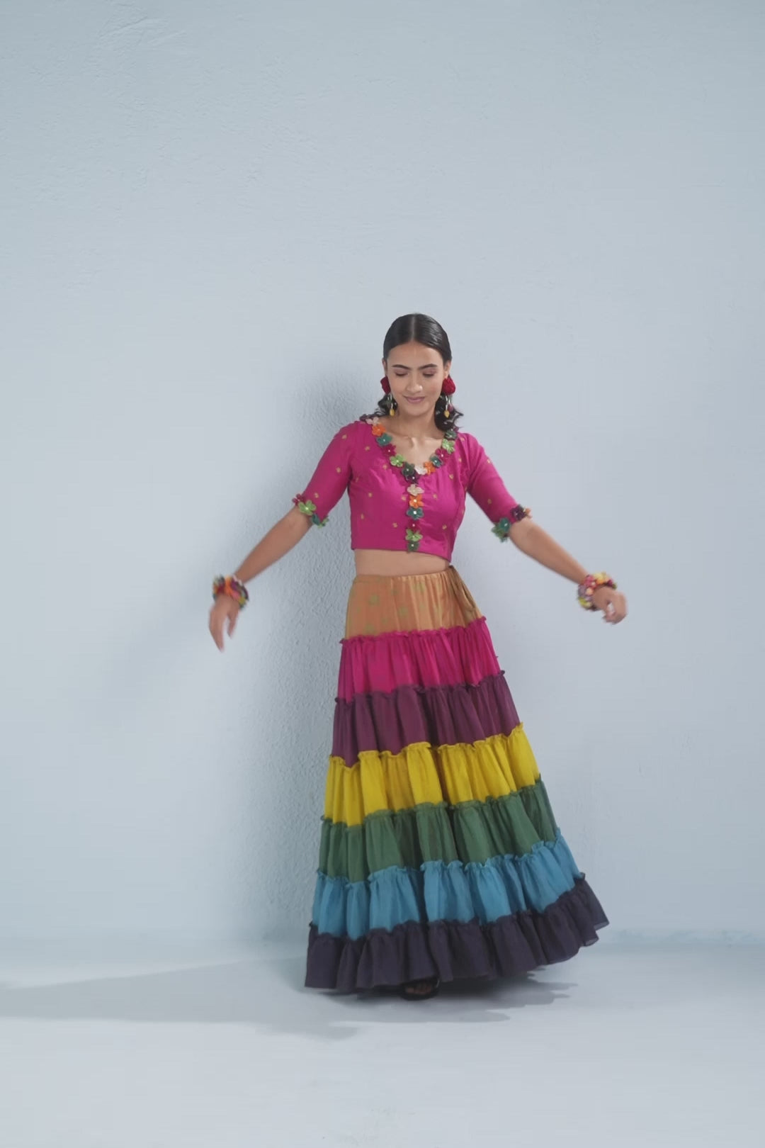 One of a kind with multi colour tiers and floral opulence, it's that classic piece of attire which you would want to cherish for years and seasons!