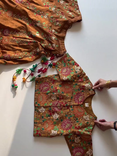 - A stunning handcrafted wedding blouse adorned with intricate embroidery and delicate zari work — designed to make every bride shine with royal grace.
