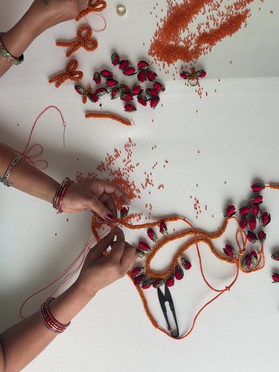 Handcrafted Mangtikka with orange bead strings, Chanderi roses, leaf details, and soft Zari shimmer.