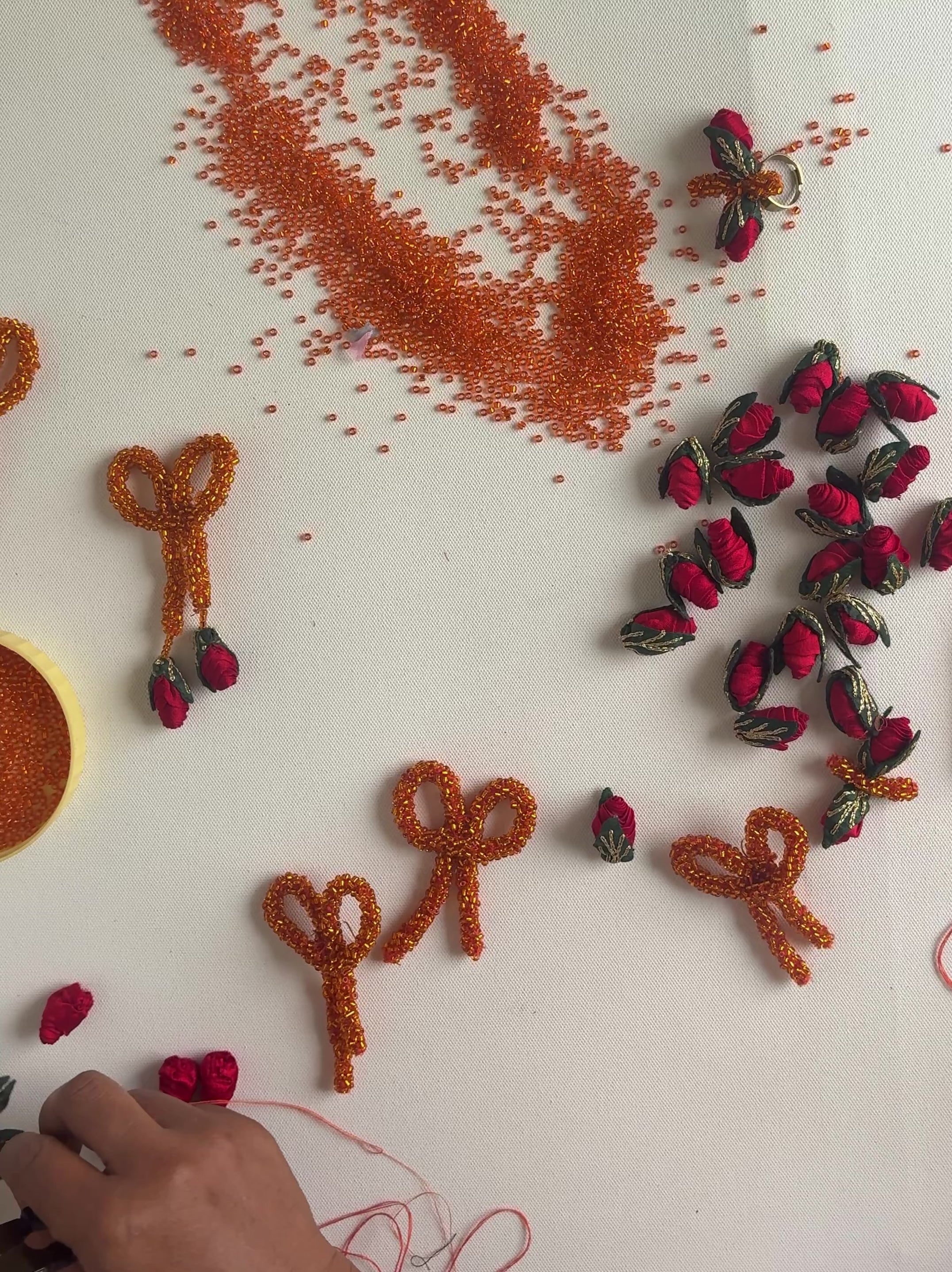 Artistic beaded accessory inspired by red roses and garden leaves.