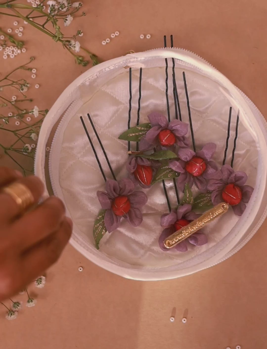 The Lavender Hair Pin, is a delicate accessory that effortlessly enhances your style. Beautiful lavender flowers are meticulously stitched to a sleek comb clip, complemented by lush leaves and charming pink buds that provide a stunning contrast.