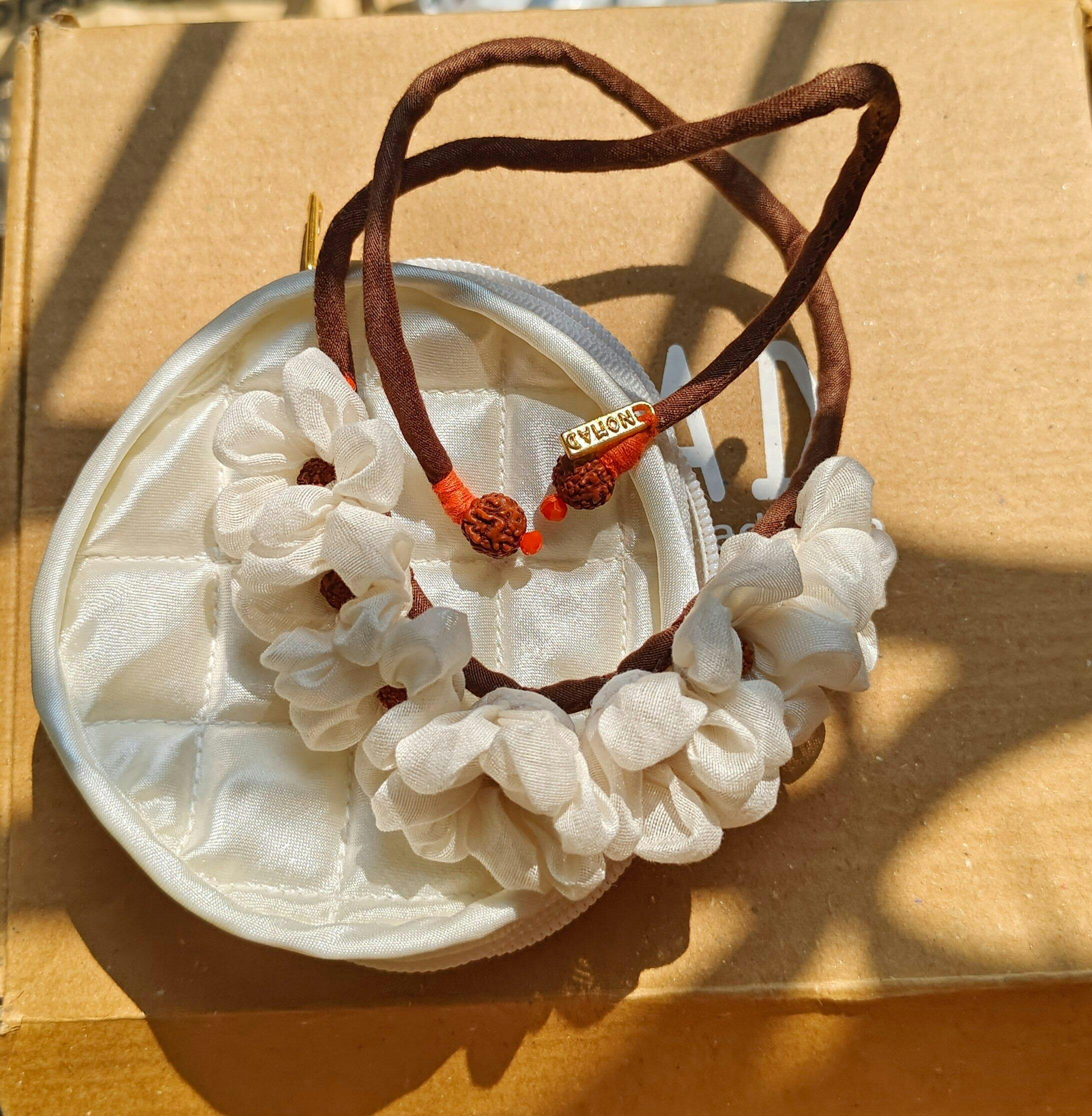 The innocence and serenity of fresh Mogra's, this floret arrangement brings a sense of calm beauty to your look. Soft ivory petals blooms together with natural Rudraksha beads.