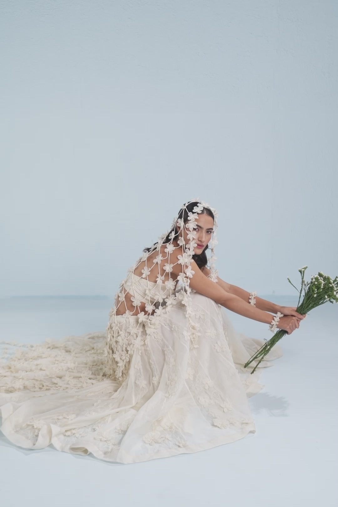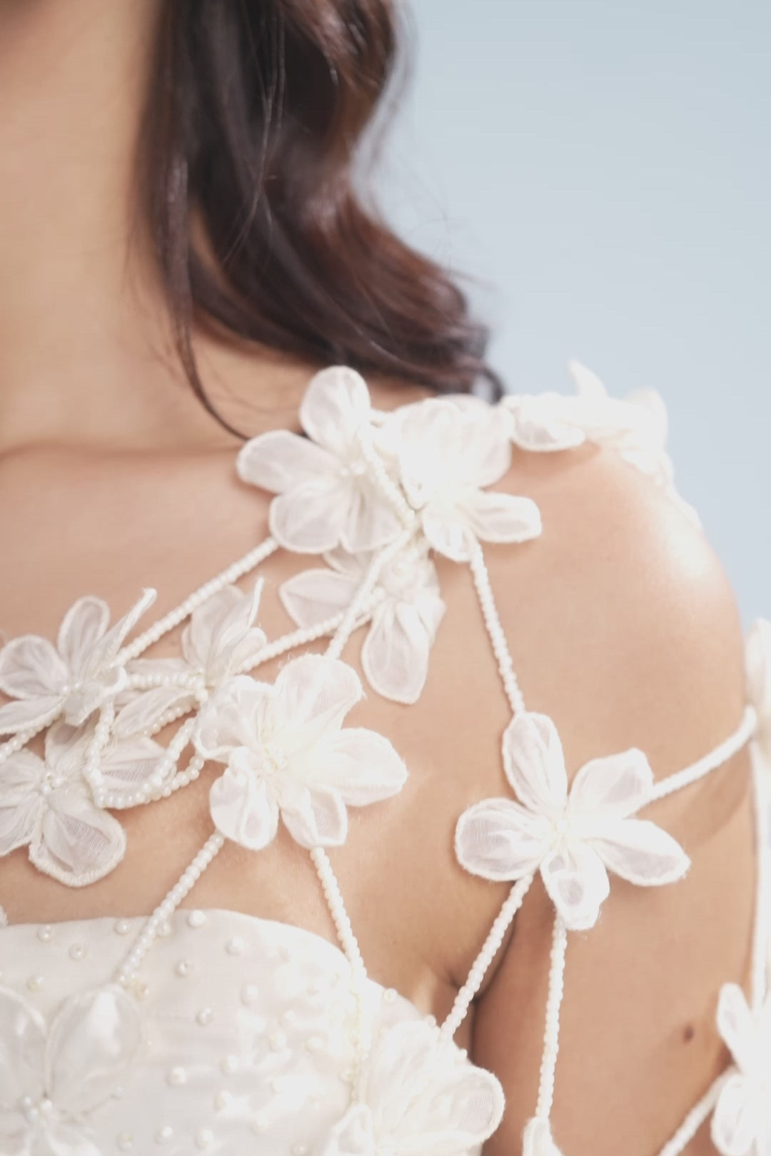 This luxurious creation is a testament to the art of intricate craftsmanship, featuring over 600 delicately attached flowers, each adorned with shimmering ivory beads.