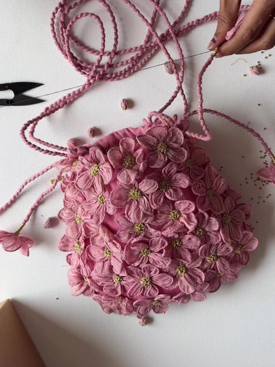 Our Nalini Bag is a combination of pink, and gold creates a sophisticated and eye-catching aesthetic. The base of the bag features a pattern of pink flowers, the flowers are further embellished with gold zari, a type of metallic thread work.