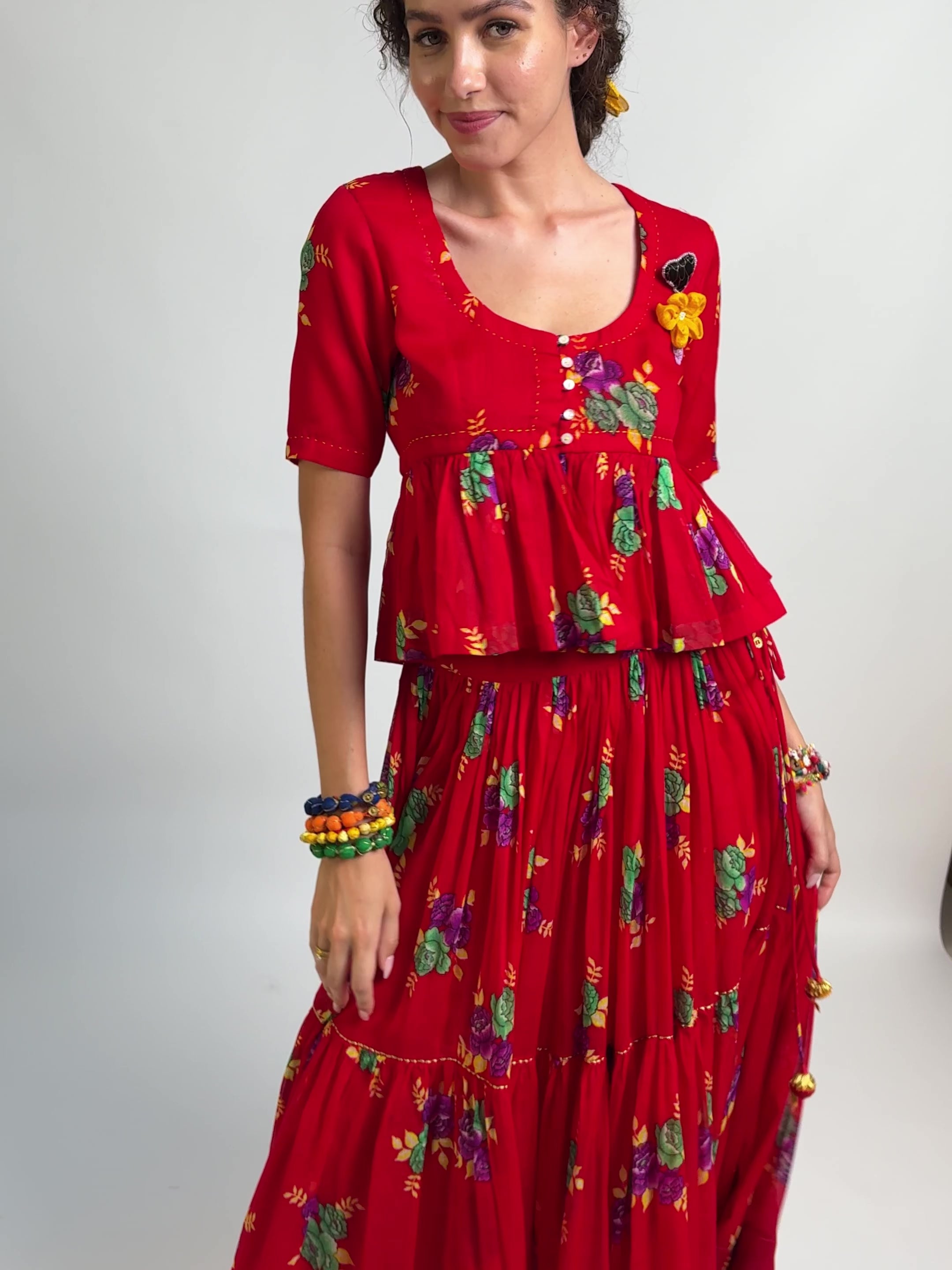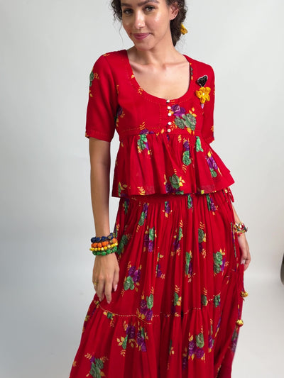 - Made in airy cotton with hand-block florals, the Navdini Ghagra flows in tiered layers and generous flare, where delicate rose motifs dance with every movement.