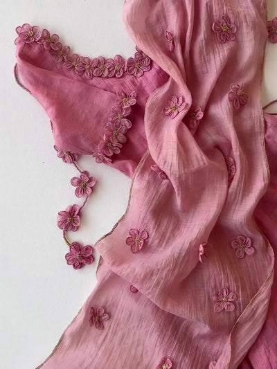 The Naveli Ghagra,Choli & Dupatta Set unfolds in a gentle rose pink, designed to echo the joy of festive nights. The ghagra, stitched with flowing panels, opens into a graceful flare, tied neatly with side buttons and a dori. Its choli is adorned with delicate floral appliqué at the neckline, sleeves, and back tie-up, adding charm to every detail. A light stole completes the look, scattered with blossoms and tasseled edges, draping with effortless grace. Woven together, the set carries the spirit of Navratri—made for twirls, songs, and the glow of village celebrations.