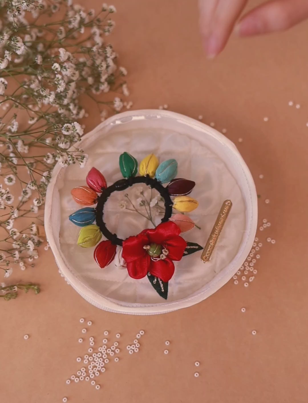 Our Navrang Rubber Band is a burst of vibrant elegance featuring a striking bright pink flower at its center, surrounded by colorful buds and lush green leaves.