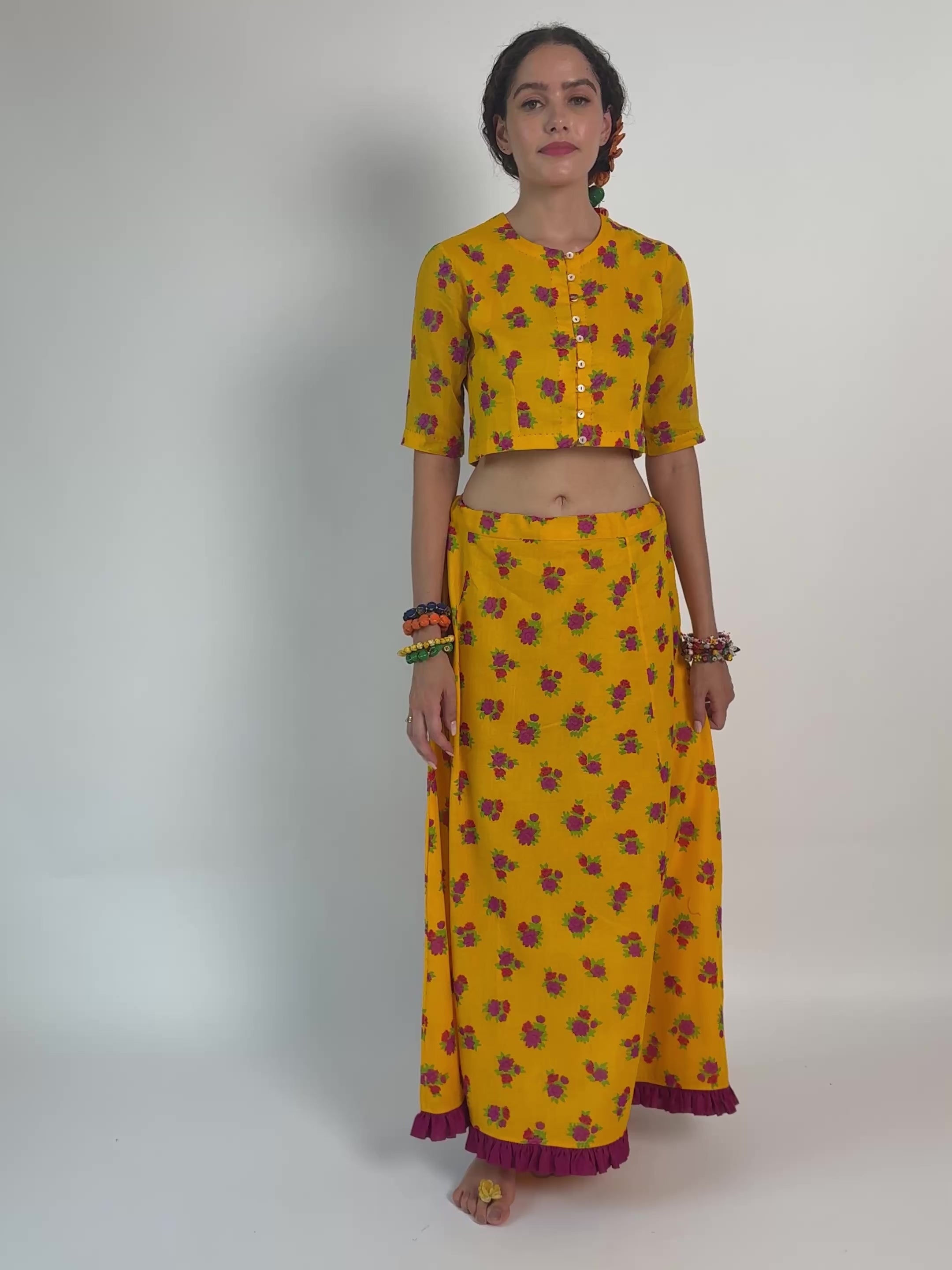 - A sunny yellow cropped Sajriya blouse, kissed with blooming pink and purple chintz, its delicate button-down closure and airy fabric make it a breath of summer joy