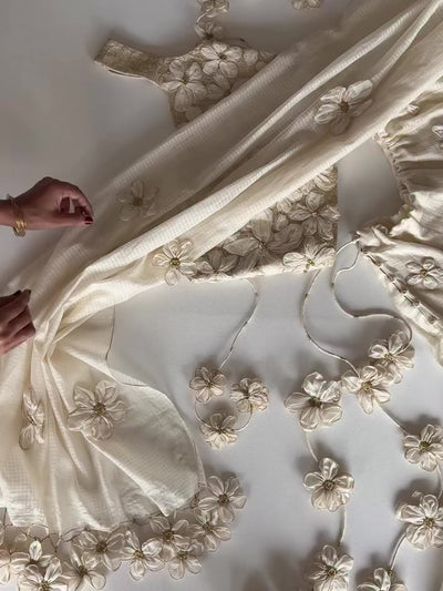 - Elevate your Diwali outfit with the off-white Sursuri Gold Blouse—its cropped silhouette highlights your waist, blending tradition with playful, youthful grace.