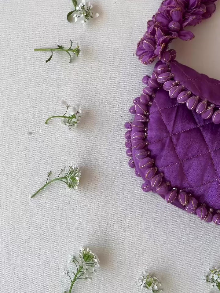 Our Syrah half-moon bag comes with quilted lining, magnetic button & a strap full of flowers. This classic bag can be filled with a whole lot of luck & love