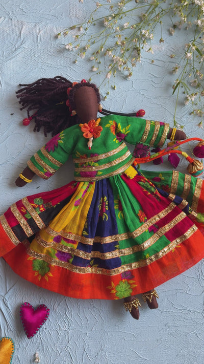 Toran Doll is a joyful handcrafted fabric doll inspired by traditional charm and festive colors. She reflects on our inert need to live playfully. We believes dolls are mirrors. They help us re-play our emotions and eventually by-pass them with newer realities and dreams.She is every girl, she is this and she is that too. Her favourite thing, getting ready and putting flowers on her hair.