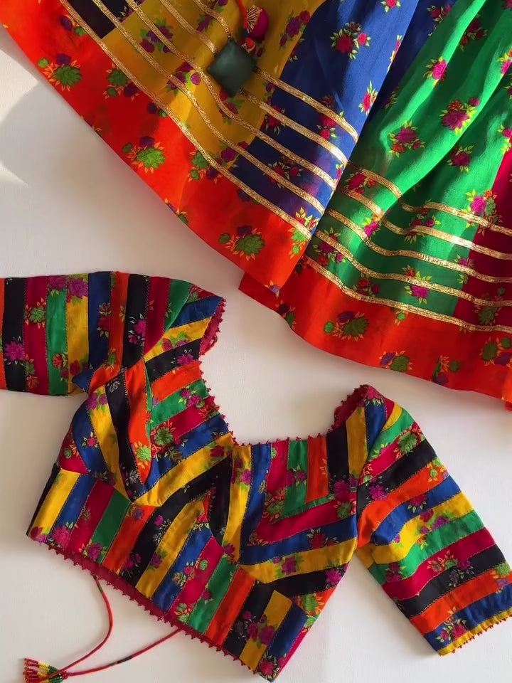 - Deep V neckline and laced back adorned with colorful bud latkans along the hem which add shimmer, movement, and a playful charm.